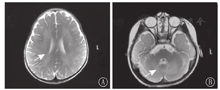 实验室检查:血常规、生化、心肌酶谱、血氨、丙酮酸、甲状腺功能未见异常;脑脊液常规、生化、培养、涂片均阴性;生长激素2.33 μg/L,总睾酮0.69 nmol/L,皮质醇83 nmol/L(正常值138~569 nmol/L);血尿遗传代谢性疾病筛查未见异常。头颅磁共振成像(MRI)检查示双侧大小脑半球白质区弥漫性异常信号,考虑遗传代谢性脑白质病(图2)。视频脑电图示背景活动偏慢,左侧额、颞区慢波发放。眼底检查提示双侧视神经有萎缩倾向。牙片提示牙列不齐及出牙不全。听力诱发电位双侧Ⅰ波潜伏期延长、双侧听性脑干反应(ABR)主观听阈轻度增高;视觉诱发电位示双侧P100潜伏期延长。