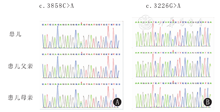 本研究获得患儿监护人知情同意,并通过安徽省儿童医院医学伦理委员会批准(批准文号:EYLL-2018-009)。分别采集患儿及其父母外周血2 mL,提取DNA,采用全外显子测序方法分析目的基因,经全外显子组测序及Sanger验证后发现患儿POLR3A基因(OMIM号606794)存在复合杂合突变(图3):c.3858C>A(p.His1286Gln)编码区第3858号核苷酸由C变为A,该变异导致第1 286号氨基酸由His变为Gln,患儿母亲携带相同的基因变异;同时c.3 226 G>A(p.Ala1076Thr)编码区第3 226号核苷酸由G变为A,该变异导致第1 076号氨基酸由Ala变为Thr,患儿父亲携带相同的杂合变异。以上均为错义突变,该变异在多个公共人群数据库(包括千人基因组、ExAC数据库等)均未见收录,多个蛋白功能预测软件(包括SIFT、PROVEAN、Polyphen2和Mutation Taster等)均预测这2个错义突变对蛋白功能有害。
