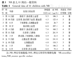 2017年3月至2019年12月河南省人民医院收治NB患儿11例。其中男7例,女4例;年龄4个月~10岁,肿瘤最大径3.6~9.5 cm。术前采用上海儿童医学中心NB-99方案[7]化疗3~5个周期,均行国际神经母细胞瘤分期系统(INSS)分期(表1)。