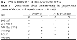 设置问卷包括对疾病的认识和感受评定两部分。其中对疾病的认识包括是否理解肿瘤性质、大小与位置、与周围血管关系、手术方式、术后并发症、术后治疗等6个问题,感受评定按是否理解进行界定。术前同主任医师(术者)用CT和3D打印模型分别向患儿监护人介绍NB及手术相关事项,患儿监护人当场填写2份调查问卷,现场收回。