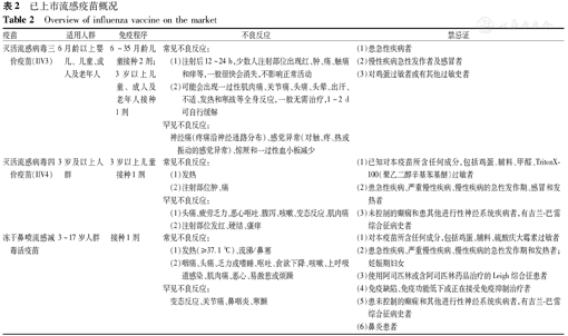 灭活流感疫苗可与其他灭活疫苗及减毒活疫苗同时或依次接种,而LAIV则需要间隔一定时间后才能接种其他减毒活疫苗[25]。流感疫苗接种是安全的,但也可见不良反应,通常是轻微的,并在几天内自行消失,极少出现严重异常反应。接种IIV部位可发生红晕、肿胀、硬结等局部反应以及发热、头痛、头晕、恶心、呕吐等全身反应,接种LAIV后可发生发热、流涕、鼻塞等类似上呼吸道感染等反应。流感疫苗接种禁忌证为对疫苗中所含任何成分(包括佐剂、甲醛、裂解剂及抗生素)过敏者。此外,LAIV接种禁忌证包括基础免疫力低下或者免疫缺陷者及其密切接触者、2~4岁患有哮喘的儿童、接种LAIV可能诱发喘息发作的人群、孕妇和使用阿司匹林或含有水杨酸成分药物治疗的儿童及青少年。《中华人民共和国药典》(2015版和2020版)均未将对鸡蛋过敏者作为禁忌。对于伴或不伴发热症状的轻中度急性疾病患者,建议症状消退后再接种,既往接种流感疫苗后6周内出现吉兰-巴雷综合征不是禁忌证,应特别注意[25]。