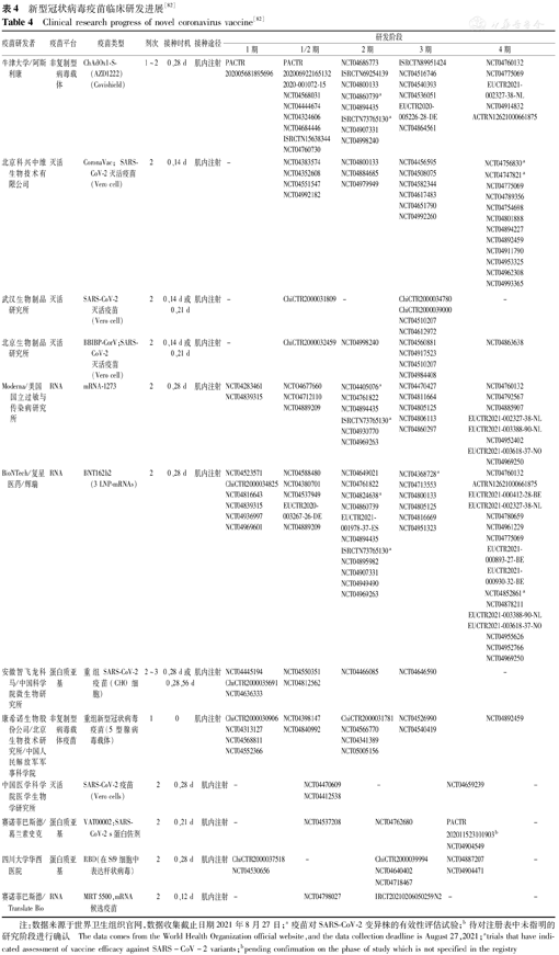 我国研发的SARS-CoV-2疫苗也取得快速进展。目前国家药品监督管理局批准附条件上市新冠疫苗有5款,分别为国药集团下属武汉生物研究所研发的灭活疫苗、国药集团下属北京生物研究所的灭活疫苗、中国人民解放军军事科学院联合康希诺公司研发的腺病毒载体疫苗、安徽智飞龙科马生物制药有限公司的重组蛋白疫苗以及北京科兴中维生物技术有限公司的灭活疫苗。我国第1个评估候选非复制型腺病毒载体(recombinant adenovirus type-5-vectored,Ad5)COVID-19疫苗免疫原性和安全性的随机对照试验,即重组新冠疫苗(腺病毒载体)Ⅱ期临床试验结果显示,受试者单次接种疫苗28 d后,99.5%产生了特异性抗体,95.3%产生了中和抗体,89%产生了特异性T细胞免疫反应,疫苗中、低剂量组血清抗体阳转率分别为96%和97%,安全性良好,为顺利开展Ⅲ期国际临床试验奠定了坚实基础[87]。中国第1个灭活病毒COVID-19疫苗的Ⅰ、Ⅱ期临床试验入组了320位受试者,Ⅰ期临床试验受试者接种3个剂量疫苗(2.5、5.0和10.0 μg/次),结果高、中、低接种剂量在接种后14 d的血清中和抗体滴度明显升高;Ⅱ期临床试验中,将接种中剂量疫苗的受试者分为两组,一组在初次免疫后第14天给予强化接种,另一组初次免疫后第21天给予强化接种,结果显示两组强化接种后的血清中和抗体滴度均明显升高。两项试验最常见的不良事件包括注射部位疼痛,其次是发热,多为轻度和自限性不良事件,未见严重不良反应[88]。境外开展的Ⅲ期临床研究结果显示,科兴中维SARS-CoV-2灭活疫苗(CoronaVac),按照0,14 d程序接种2剂疫苗,14 d后预防COVID-19的保护效力为91.25%。由中国工程院院士、军事科学院军事医学研究院与康希诺生物合作研发的腺病毒载体疫苗Ad5-nCoV在巴基斯坦进行的Ⅲ期临床试验中期分析结果显示,单针接种后对重症新冠肺炎的保护率为100%,总体保护率为74.8%。因SARS-CoV-2在流行过程中不断变异,据全球共享流感数据倡议组织(Global Initiative of Sharing All Influenza Data,GISAID)数据库显示,目前流行的突变株主要为Alpha、Beta、Gamma、Delta[89]。研究数据显示,北京生物研究所新冠疫苗BBIBP-CorV接种者血清对Alpha突变株的中和滴度与野生型相比有所提高(1.4倍),而对Beta突变株的中和滴度为野生型的0.4倍;科兴中维新冠疫苗CoronaVac接种者血清对Alpha突变株的中和滴度与野生型相比显著降低(0.5倍,P=0.004),对Beta突变株中和滴度为野生型的0.3倍(P<0.001)[90]。