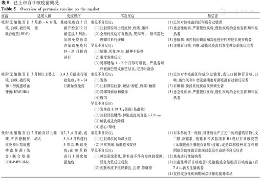 WHO认为接种含百日咳成分疫苗的目的是降低婴幼儿罹患严重疾病的风险。百日咳疫苗可分为全细胞百日咳疫苗(whole-cell pertussis vaccine,wP)及无细胞百日咳疫苗(acellular pertussis vaccine,aP)。wP、aP分别与白喉类毒素和破伤风类毒素联合组成全细胞百白破联合疫苗(diphtheria,tetanus and whole-cell pertussis combined vaccine,DTwP)及无细胞百白破联合疫苗(diphtheria,tetanus and acellular pertussis combined vaccine,DTaP)。1978年我国实施国家免疫规划后,DTwP在全国范围内普及,2011年基本完成DTaP对DTwP的替代。目前常用的含百日咳成分联合疫苗主要包括DTaP以及以DTaP为基础制备的DTaP-b型Hi(结合)联合疫苗(DTaP-haemophilus influenzae type b vaccine,DTaP-Hib)、DTaP-灭活脊髓灰质炎-b型Hi(结合)联合疫苗(DTaP-inactivated polio-haemophilus influenzae type b vaccine,DTaP-IPV-Hib)。我国一项开放、随机、对照Ⅲ期临床研究结果显示,吸附无细胞百白破、灭活脊髓灰质炎和b型Hi(结合)联合疫苗(DTaP-IPV//PRP~T联合疫苗)对每种抗原的血清保护率/血清转换率均与DTaP、Hib结合疫苗和灭活脊髓灰质炎疫苗(inactivated polio vaccine,IPV)等效,且安全性相似[129]。在免疫原性及安全性相当的情况下,多联疫苗的使用可简化免疫程序,并提高接种疫苗的依从性和覆盖率。DTaP具有良好的安全性,局部和全身不良反应一般是轻微、短暂的。WHO推荐所有儿童进行百日咳预防接种,接种起始年龄为≥6周龄,且不晚于8周龄,6月龄内完成3剂基础免疫[130]。