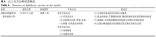 我国目前对适龄儿童实施的是5剂次含白喉类毒素成分疫苗常规免疫程序,即在3、4、5和18~24月龄各接种1剂次DTaP疫苗,在6周岁时接种1剂次DT疫苗。有研究证实,给予成人3剂或婴儿4剂白喉类毒素抗原疫苗后,抗白喉毒素抗体水平>0.1 IU/mL可达到95%以上,预测白喉类毒素抗体的临床有效保护率为97%[138]。白喉类毒素疫苗是现有最安全疫苗之一,严重反应较罕见。孕妇和新生儿中也未发现因疫苗接种导致的严重不良反应,系统回顾性研究表明,接种与未接种DTaP母亲所生婴儿的孕龄、出生体质量、Apgar评分和新生儿并发症等差异均无统计学意义[144]。母体抗毒素抗体高滴度可能影响婴儿的免疫应答,或可导致婴儿期在接种前2剂含白喉类毒素疫苗后免疫应答降低,因此在2017年WHO白喉疫苗的意见书中指出,对新生儿白喉预防无需通过孕妇接种疫苗[137]。研究显示大多数婴儿完成3剂初免接种后可产生保护性抗体,含DTP疫苗初免完成后,94%~100%的儿童抗白喉抗体水平>0.01 IU/mL,可获得完全保护作用[137]。