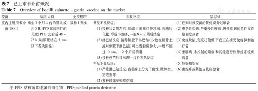 | 皮内注射用卡介苗(BCG) | 出生3个月以内的婴儿或用5 IU PPD试验阴性的儿童(PPD试验后48~72 h局部硬结在5 mm以下者为阴性) | 接种1剂次 | 常见不良反应:(1)接种后2周左右,局部可出现红肿浸润,若随后化脓,形成小溃疡,一般8~12周后结痂(2)淋巴结反应,接种侧腋下淋巴结(少数在锁骨上或对侧腋下淋巴结)可出现轻微肿大,一般不超过10 mm,1~2个月后消退(3)接种疫苗后可出现一过性发热反应罕见不良反应:(1)严重淋巴结反应:在临床上分为干酪性、脓肿型、窦道型等(2)复种时偶见瘢痕疙瘩 | (1)已知对该疫苗的任何成分过敏者(2)患急性疾病、严重慢性疾病、慢性疾病的急性发作期和发热者(3)免疫缺陷、免疫功能低下或正在接受免疫抑制治疗者(4)患脑病、未控制的癫痫和其他进行性神经系统疾病者(5)妊娠期妇女(6)患湿疹或其他皮肤病患者 |