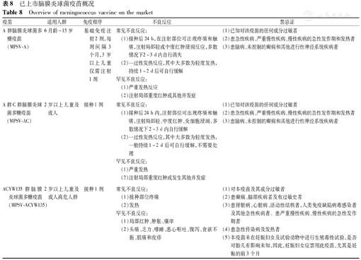 | ACYW135群脑膜炎球菌多糖疫苗(MPSV-ACYW135) | 2岁以上儿童及成人高危人群 | 接种1剂 | 常见不良反应:(1)接种部位疼痛(2)发热罕见不良反应:(1)局部红肿、肿胀、瘙痒(2)头痛、乏力、嗜睡、恶心呕吐、腹泻、食欲不振、肌痛和皮疹 | (1)对本疫苗及其成分过敏者(2)患癫痫、脑部疾病者及有过敏史者(3)患肾脏病、心脏病、活动性结核者,人类免疫缺陷病毒感染者及其他急性疾病者。患严重慢性疾病、慢性疾病的急性发作期者(4)患急性传染病及发热者(5)本疫苗未在妊娠妇女及试验动物中进行生殖毒性试验,是否对胎儿有影响未知,因此,妊娠妇女应禁用此疫苗,尤其是妊娠的前3个月 |