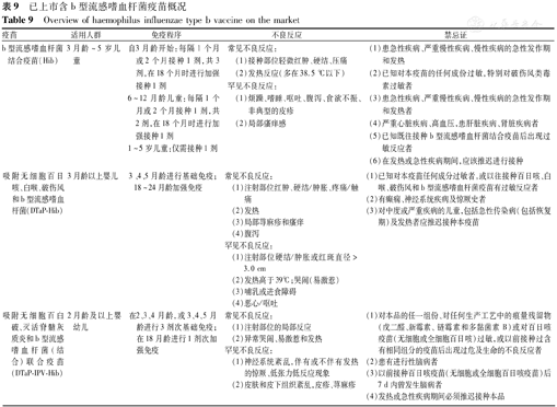 | b型流感嗜血杆菌结合疫苗(Hib) | 3月龄~5岁儿童 | 自3月龄开始:每隔1个月或2个月接种1剂,共3剂,在18个月时进行加强接种1剂6~12月龄儿童:每隔1个月或2个月接种1剂,共2剂,在18个月时进行加强接种1剂1~5岁儿童:仅需接种1剂 | 常见不良反应:(1)接种部位轻微红肿、硬结、压痛(2)发热反应(多在38.5 ℃以下)罕见不良反应:(1)烦躁、嗜睡、呕吐、腹泻、食欲不振、非典型的皮疹(2)局部瘙痒感 | (1)患急性疾病、严重慢性疾病、慢性疾病的急性发作期和发热(2)已知对本疫苗的任何成份过敏,特别对破伤风类毒素过敏者(3)患急性疾病、严重慢性疾病、慢性疾病的急性发作期和发热者(4)严重心脏疾病、高血压,患肝脏疾病、肾脏疾病者(5)已知既往接种b型流感嗜血杆菌结合疫苗后出现过敏反应者(6)在发热或急性疾病期间,应该推迟进行接种 |