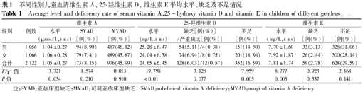 Average level and deficiency rate of serum vitamin A,25-hydroxy vitamin D and vitamin E in children of different genders