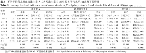Average level and deficiency rate of serum vitamin A,25-hydroxy vitamin D and vitamin E in children of different ages