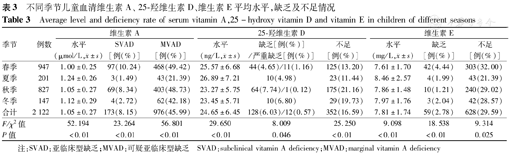 Average level and deficiency rate of serum vitamin A,25-hydroxy vitamin D and vitamin E in children of different seasons