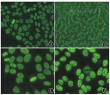 (1)HEp-2细胞[6]:分裂间期HEp-2细胞核浆呈现均匀一致的致密细斑点型的荧光染色,核仁区荧光染色与核浆类似或阴性;分裂期细胞浓缩的染色体区也呈现均匀一致的DFS荧光染色,染色体区域外荧光染色阴性。(2)猴肝组织冷冻切片:肝细胞核常呈现荧光染色阴性或细颗粒型荧光染色,荧光强度弱于HEp-2细胞(图1A、图1B)。(3)与细胞核均质型荧光模式鉴别要点:细胞核均质型在分裂间期HEp-2细胞呈均质型或均质周边型荧光染色,猴肝组织冷冻切片中肝细胞核常呈现均质型荧光染色,荧光强度与HEp-2细胞荧光强度基本一致。与典型的细胞核斑点型荧光模式鉴别要点:典型的细胞核斑点型在分裂期HEp-2细胞的浓缩染色体荧光染色阴性[7] (图1C、图1D)。