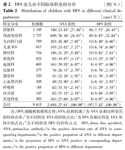 抗核抗体(ANA)作为自身免疫性疾病(AID)重要的生物学标志,是临床应用中最广泛、最基础的一组自身抗体[1]。以人喉癌上皮细胞(HEp-2细胞)为基质的间接免疫荧光法(IIF)检测一直被美国风湿病学会(American College of Rheumatology,ACR)、欧洲自身免疫标准化促进会( European Autoimmunity Standardization Initiative,EASI)等专业学会推荐为ANA检测的"参考方法"[2]。2014年国际自身抗体和自身免疫研讨会上,形成ANA HEp-2细胞间接免疫荧光染色模型命名标准化国际共识[3],将细胞核致密斑点型(DFS)作为必报荧光模型,而国内自身抗体检测实验室人员对该荧光模型认识严重不足,常将DFS作为细胞核均质型或细胞核斑点型报告。近年国外研究较多的DFS荧光模式,在ANA阳性者中多见,特别是在ANA阳性的健康者中可达24.0%~33.1%[4,5]。而国内对于ANA荧光模式为DFS的相关临床意义却少有报道,国内外在儿童中的报道更是少见。对此,本研究就DFS在儿科疾病中的阳性检出情况进行回顾性分析,并探讨其在儿童AID诊断中的价值。