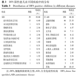 分析致密细斑点型抗核抗体(DFS)阳性患儿的临床特点及实验室检查指标差异,探讨DFS阳性在儿童免疫性疾病诊断中的价值。