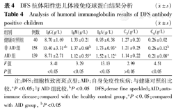 197例患儿中ASO阳性率为34.44%(31/90例),IgE阳性率为48.72%(19/39例),IgG4阳性率为16.67%(10/60例),RF阳性率为3.6%(2/56例);在DFS阳性患儿中,混合细胞质颗粒型ANA核型3例,抗中性粒细胞胞质抗体(P-ANCA)3例;ANAs检测结果中,特异性抗体均为阴性。