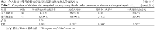 41例患儿行外科修补术,其中12例同时行其他心内结构畸形矫治术,均成功关闭瘘口,但2例因随访中残余分流量逐渐增大再次行介入封堵术。1例1月龄患儿诊断房间隔缺损并右冠右室瘘,于体外循环下行手术,术中纠治房间隔缺损及CAF,但术后出现心律失常、心功能不全,考虑与瘘口位置特殊罕见,寻找困难,术中心肌缺血或心肌牵拉损伤相关,予抗心律失常药物后效果不佳,予体外膜肺氧合(ECMO)后心功能明显好转,但出现颅内出血,家属考虑可能潜在的后遗症,放弃治疗后患儿死亡;2组患儿治疗对比情况见表2。