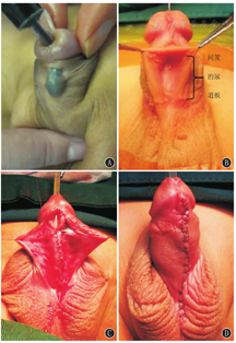 分期手术步骤:Ⅰ期手术时横断尿道、脱套、松解、纠正弯曲与上面所述相同。然后仿Byar′s术式转移背侧包皮内板缝合于尿道两断端之间缺损区域形成新的尿道板。6个月后行Ⅱ期手术,于尿道板两侧做平行切口(仿DUPLAY)或必要时加做尿道板中线纵行切口(仿TIP),两端分别绕过开口汇合,呈椭圆形切口(图1B),适当松解后使尿道板围绕F8或F10单腔硅胶导尿管成形新尿道(图1C)。再利用两侧筋膜覆盖新尿道,最后裁剪皮肤缝合覆盖阴茎腹侧创面(图1D)。