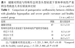 健康对照组与特殊形态阴茎头型尿道下裂和单纯性严重阴茎弯曲患儿术后尿流率比较 (