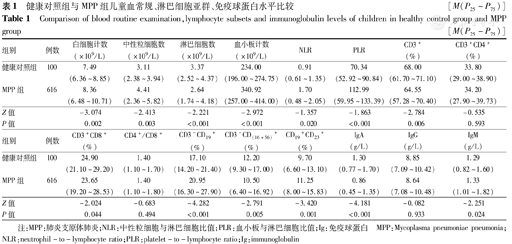 MPP组患儿白细胞计数(WBC)、中性粒细胞数(N)、血小板计数(PLT)、NLR、PLR、IgM的中位数及CD3-CD19+、CD19+CD23+百分比均高于健康对照组;淋巴细胞数(L)、IgA及CD3+、CD3+CD8+、CD3-CD+(16+56)百分比均低于健康对照组,差异均有统计学意义(均P<0.05);2组CD4+/CD8+比值、IgG及CD3+CD4+百分比比较差异均无统计学意义(均P>0.05)。结果见表1。