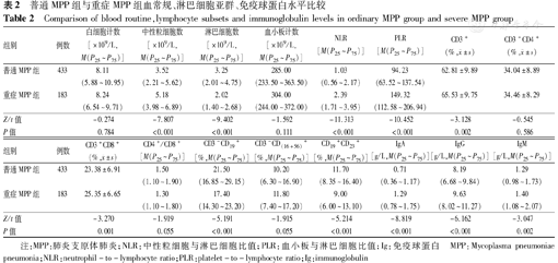 Comparison of blood routine,lymphocyte subsets and immunoglobulin levels in ordinary MPP group and severe MPP group