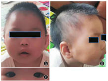 回顾性个案病例分析。患儿,女,孕36+4周剖宫产出生,出生时头围37 cm,身长45 cm,体质量2 350 g,出生后因"早产、新生儿呼吸窘迫综合征"住院治疗,9 d后痊愈出院。患儿3月龄时发现抬头无力、肌张力偏低,6月龄方可抬头,10月龄独坐,至1岁3个月就诊时,查体:头围40.2 cm(<P3),身高72.2 cm(<P3),体质量8 kg(<P3)。神志清楚,目光呆滞,能扶站,不能独自站立,不能扶走,听力正常,不能主动表达任何有意义的词语,智能发育迟缓。面容特殊,头小、鼻梁下陷、眼睛凹陷、内眦赘皮、手指短粗(图1);中性粒细胞计数减少(0.84×109/L),心脏超声检查显示室间隔缺损嵴下膜周型(直径3.4 mm),头部磁共振检查显示双侧脑室前角旁呈管膜下小囊肿,视频脑电图曾出现两侧额极尖波,但未出现过明显抽搐。肝脾不大,四肢肌张力减低,腱反射(+),病理征(-)。Gesell婴幼儿智力发育评估(1岁3个月):粗大运动62分,精细运动57分,适应性行为56分,语言51分,个人-社交48分。患儿父母健康。本研究通过医院医学伦理委员会批准(批准文号:2021-101),患儿监护人均知情同意,并签署知情同意书。