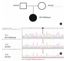 对患儿及患儿父母行基因组全外显子2代测序,检测结果提示患儿父母均为野生型,患儿WAC基因第1090位A出现重复,导致编码WAC蛋白的第365位的精氨酸突变为赖氨酸,并产生移码突变,WAC蛋白随后截短为377个氨基酸(c.1090dupA,p.Arg364Lysfs*14)(图2)。该突变是未见报道的一种新的突变。