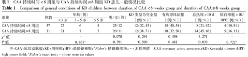 Comparison of general conditions of KD children between duration of CAA<8 weeks group and duration of CAA≥8 weeks group