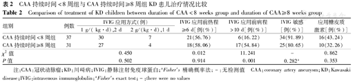 Comparison of treatment of KD children between duration of CAA<8 weeks group and duration of CAA≥8 weeks group