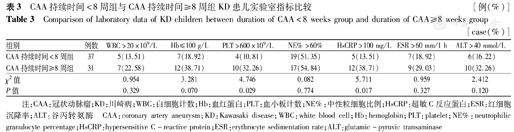 Comparison of laboratory data of KD children between duration of CAA<8 weeks group and duration of CAA≥8 weeks group [case(%)]