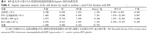 KD患儿中小型CAA持续时间危险因素的Logistic回归分析结果