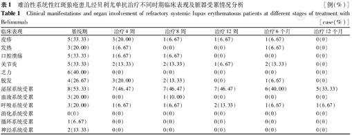 Clinical manifestations and organ involvement of refractory systemic lupus erythematosus patients at different stages of treatment with Belimumab[case(%)]
