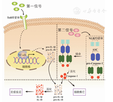自2002年Martinon等[12]首次提出炎症小体的概念后,近20年来其被争相研究及报道。炎症小体是一类多蛋白复合体,组成结构包括胞浆分子识别受体(pattern recognition receptor,PRR)、衔接蛋白凋亡相关斑点样蛋白(apoptosis-associated speck-like protein containing CARD,ASC)和效应蛋白半胱天冬酶-1前体(pro-Caspase-1)三部分[13]。目前已报道的炎症小体包括NLRP1、NLRP3、IL-1β转换酶蛋白激活因子(interleukin-1beta-converting enzyme-protease activating factor,IPAF)和黑色素瘤缺失因子2(absent in melanoma 2,AIM2),其中NLRP3研究最多,能被多种病原体所激活[14]。NLRP3炎症小体的活化机制目前尚不清楚,报道显示与活性氧(reactive oxygen species,ROS)产生[15,16]、溶酶体受损[17,18]、K+外流[19]等相关。其活化过程分3个阶段:(1)第一信号与细胞膜上Toll样受体结合,激活核转录因子κB(NF-κB),产生大量炎症因子前体(包括pro-IL-1β和pro-IL-18);(2)第二信号与NLRP3受体结合,通过衔接蛋白ASC结合pro-Caspase-1形成炎症小体,并使无活性的pro-Caspase-1转换为具有酶活性的Caspase-1;(3)活化的Caspase-1加工pro-IL-1β和pro-IL-18生成IL-1β和IL-18,参与促炎作用,另外Caspase-1介导细胞焦亡(图2)。