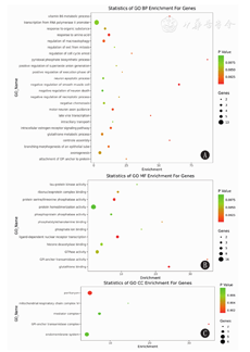 对DEGs进行GO功能富集分析,BP、MF、CC的富集结果见图2(P<0.01)。DEGs主要参与神经发生、神经元凋亡、氧化应激、转录调控、细胞周期等生物学过程,如轴突生成、运动神经元轴突导向、神经元凋亡过程、凋亡执行阶段的正向调控、超氧阴离子生成的正向调控、RNA聚合酶Ⅱ启动子的转录、细胞周期阻滞的调控等;DEGs显著富集于配体依赖的核受体转录辅激活因子活性、三磷酸鸟苷(GTP)酶活性、组蛋白去乙酰化酶结合、Tau蛋白激酶活性等分子功能;并与线粒体的呼吸链复合体、内膜系统等细胞成分有关。