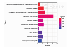 对DEGs进行KEGG通路富集分析(图3),结果显示DEGs主要参与神经退行性疾病相关信号通路,如亨廷顿病、帕金森病、肌萎缩侧索硬化症、阿尔茨海默病(AD)等。