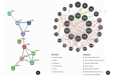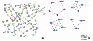 PPI网络是利用基因相互作用检索工具(search tool for the retrieval of interacting genes,STRING)构建的,STRING是一个在线软件,用于探索蛋白质之间的功能相互作用[11]。中位置信度≥0.4,并隐藏网络中未连接的节点,获得原始PPI数据后,通过Cytoscape软件对PPI网络进行分析[12]。MCODE是Cytoscape软件的一个插件,用于从PPI网络中检测密集连接的区域。通过MCODE聚类分析识别出的关键模块可能在疾病的发病机制中发挥重要作用。