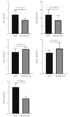 为进一步明确上述核心基因在DS神经病理发生过程中的作用,本研究选择与神经退行性变密切相关5个核心基因(POLR2F、TBP、TAF6、RELA和RAB8A),利用3对DS和正常胎儿脑组织标本进行实时定量PCR验证。经验证,TBP、TAF6和RAB8A的表达水平与基因表达谱数据相一致,其中RAB8A具有显著统计学意义(图7)。