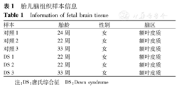 回顾性研究。本研究所用DS及正常胎儿脑组织标本均来自就诊于北京大学人民医院的孕妇。病例组标本:孕妇经羊水穿刺染色体核型鉴定确诊胎儿为21号染色体三倍体核型,并行治疗性引产;对照组标本:孕妇在产前诊断中未发现畸形,羊水穿刺染色体核型鉴定确诊胎儿为正常核型,因非病理性原因引产。病例组与对照组所得胎儿脑组织标本在胎儿性别、胎龄及标本来源脑区相匹配(表1)。本研究通过北京大学人民医院医学伦理审查委员会批准(批准文号:2020PHB283-01),所有参与研究的孕妇均知情同意,并签署知情同意书。