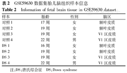 2021年12月从基因表达数据库(gene expression omnibus,GEO)[6]下载GSE59630数据集。该数据集基于GPL5175平台,系统分析了从胎儿期到成年期DS和正常个体死后脑组织的基因表达谱。本研究重点关注胎儿期的基因表达变化(表2),胎儿期是神经系统发生发育的关键阶段,这一时期的神经发育异常直接导致出生后的大脑发育障碍和智力低下。