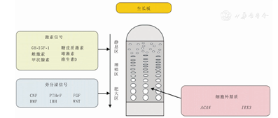在生长板上发挥驱动作用的内分泌信号包括胰岛素、GH-IGF-1轴、四碘甲状腺原氨酸(T4)和三碘甲状腺原氨酸(T3)轴、雄激素、雌激素、维生素D、糖皮质激素等,可能还有瘦素,构成一个极其复杂的系统。