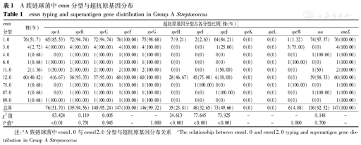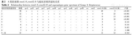 | 超抗原基因谱类型 | 株数 | speA | speB | speC | speF | speG | speH | speI | speJ | speK | speL | speM | ssa | smeZ | emm1.0(株) | emm12.0(株) | P值 |