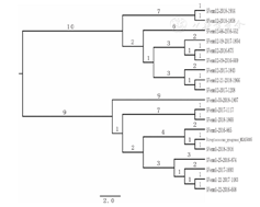 (1)共有基因和特有基因:将所有待分析菌株的基因集进行聚类分析,将得到的基因集作为总基因集,提取聚类结果中每个样品都有的序列为核心基因集,特有的序列为特有基因集。(2)单核苷酸多态性(SNP)及插入或缺失(InDel)检测:SNP检测与注释基于组装结果和参考序列比对进行,首先对过滤后的序列进行组装,将组装结果与参考序列进行比对,进行SNP及基因组的某个位置上所发生的小片段序列的InDel。(3)基于SNP位点分析构建遗传进化树:按照相同顺序将所有SNP相连,获得相同长度的序列(其中一个为参考序列),作为输入文件,用TreeBeST软件的最大似然法算法构建系统进化树。