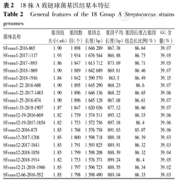 基于测序数据组装得到18株GAS基因组,由27~82个片段组成,大小为1.82~1.93 Mb,GC含量为39.03%~39.15%,编码区占基因总长的86%以上,18株GAS基因组基本特征与参考序列基因组特征相似,见表2。
