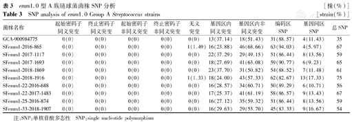 emm1.0型A族链球菌菌株SNP分析 [株(%)]