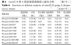通过与参考序列GCA-900984775进行比对,InDel类型统计和InDel引起的突变类型分见表5、表6。InDel分析中,emm12.0型菌株插入数[4(3,6)]个,缺失数[8(6,10)]个大于emm1.0型菌株插入数[1(0,2)]个,缺失数[5(3,7)]个,见图2。