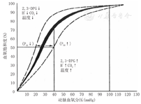 SO2与PO2的关系并不是线性关系,而是呈"S"形的曲线关系(图1),称为氧合血红蛋白解离曲线(oxygen dissociation curve),简称氧离曲线,表示在不同PO2下,O2与Hb的解离与结合情况[15]。在曲线的上段,相当于PO2在60~100 mmHg时比较平坦,在这个区间PO2的变化对SO2变化影响不大。只要PO2不低于60 mmHg,SO2仍可维持在90%以上,血液仍能携带足够的氧,不至于导致组织缺氧;曲线的中段较陡,相当于PO2在40~60 mmHg,此时PO2的轻微下降即可引起SO2的明显下降,有利于HbO2释放大量的氧气至组织中;在曲线的下段,相当于PO2在15~40 mmHg时的氧饱和度,该区间曲线最为陡直,当组织活动增强时,HbO2进一步解离,O2释放明显增多,是安静时的3倍,以满足机体需要,反映了机体的O2贮备能力。
