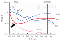 高铁血红蛋白(MetHb)增多可过低估计SpO2。在波长660 nm时,MetHb对红光的吸收与HHb相似,在波长940 nm时,MetHb对近红外光的吸收作用较HbO2或HHb更强(图2[70]),因此在2个波长上都引起大的光吸收脉冲,导致光吸收比率(R值)的分子分母同时增大。随着血液中MetHb的含量增高,R值趋向于1,SpO2趋向于85%,导致SpO2假性降低[70,75]。