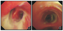 急性期住院期间,26例均因肺实变、广泛渗出而接受支气管镜检查,镜下多表现为黏膜充血、糜烂,2例并发塑型性支气管炎(图2)。15例合并PIBO的支气管扩张症患儿随访过程中因急性加重行支气管镜检查。镜下表现均为黏膜充血,管腔大量淡黄色黏稠分泌物,仅1例见"鱼骨征"(图3)。