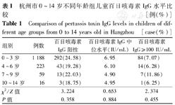Comparison of pertussis toxin IgG levels in children of different age groups from 0 to 14 years old in Hangzhou [case(%)]