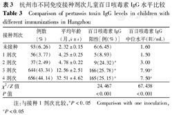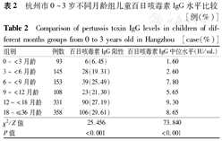 Comparison of pertussis toxin IgG levels in children of different months groups from 0 to 3 years old in Hangzhou [case(%)]