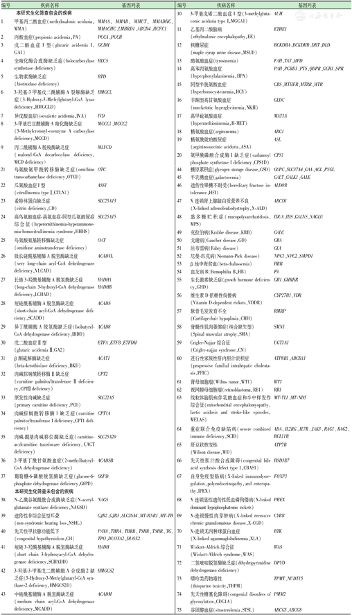 | 38 | N-乙酰谷氨酰胺合成酶缺乏症(N-acetylglutamate synthase deficiency,NAGSD) | NAGS |