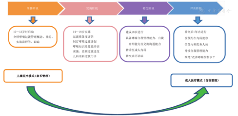 患者10~13岁时启动过渡准备。制定本单位实施青春期哮喘过渡管理的工作制度和规范,包括纳入对象、过渡干预频度、工作人员资质、获得患者支持、联络方式等,通过宣传册、视频等对进入或即将进入青春期的哮喘患者及其家长宣传过渡管理的概念、目标及实施流程等,使其提前做好准备,增加过渡意愿。该阶段由儿科医务人员完成。